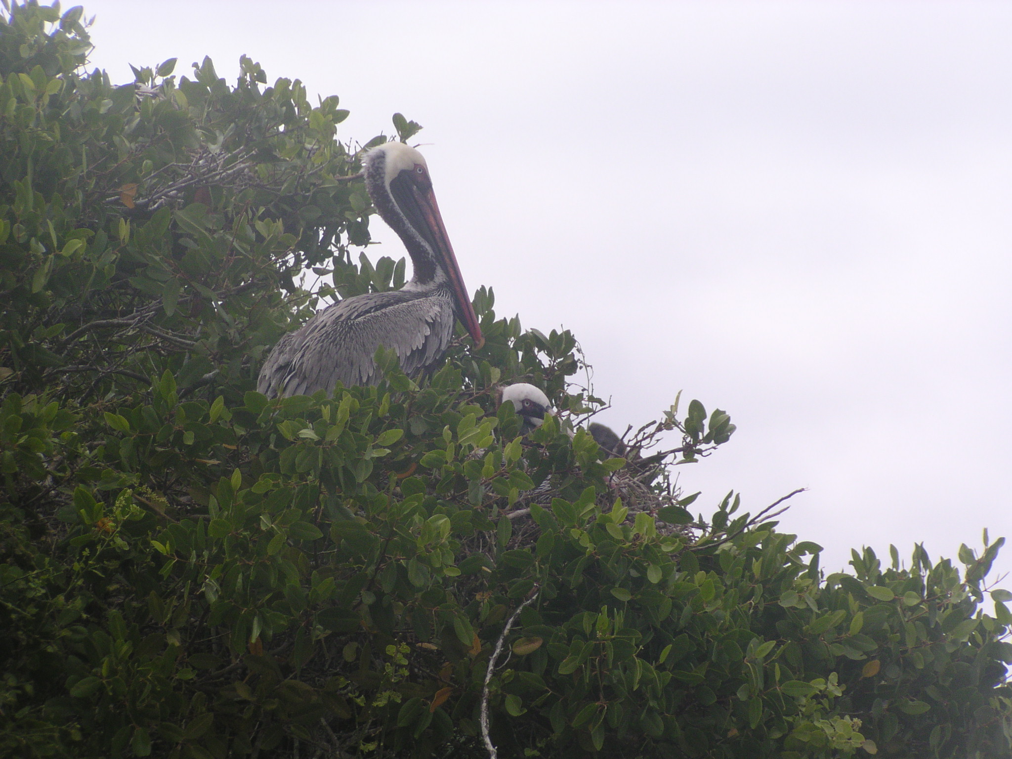 description:Brown pelicans build their nests with twigs and bush branches on mangrove trees