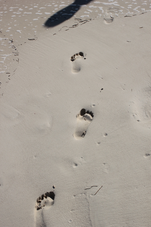 description:A line of foot prints has passed by the waterlines on the coast.