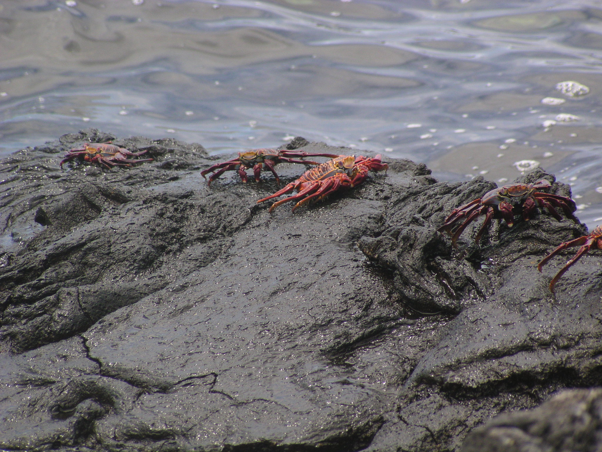 description:Red rock crabs climbing out of water.