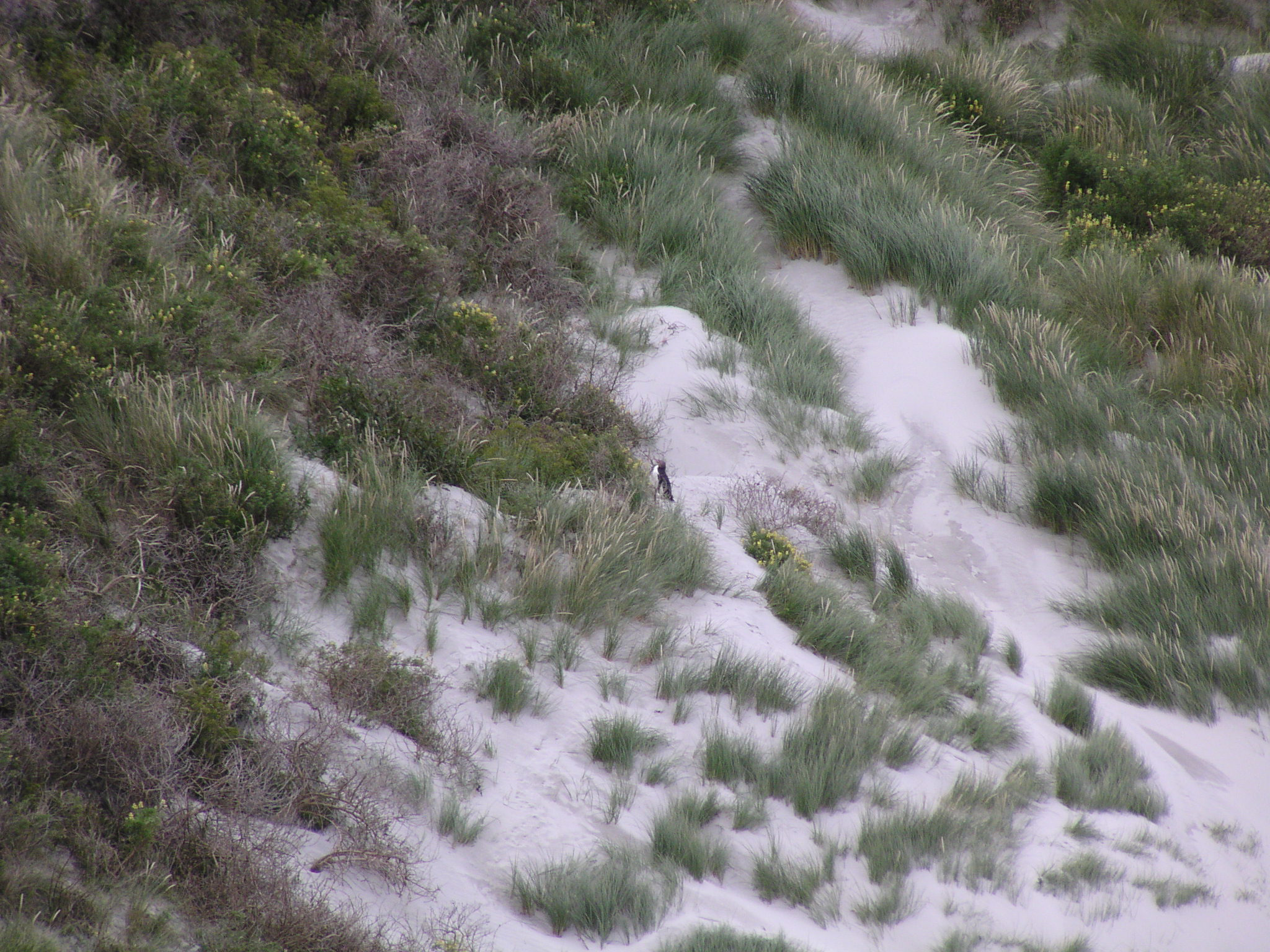 description:Grass covered dunes and a pinguin.